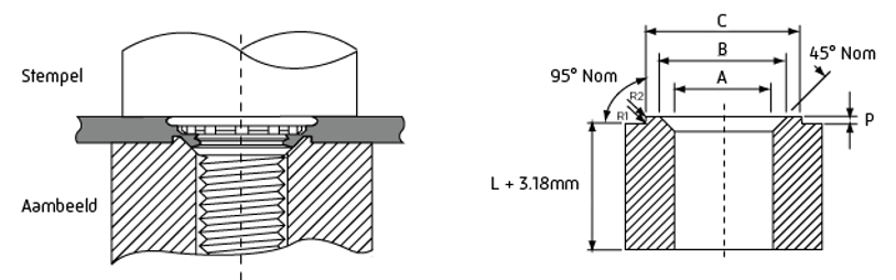 Selecteer de juiste gatmaat uit de onderstaande tabel voor de gewenste inpersbout. Stans het gat in het plaatmateriaal en plaats dit op het juiste aambeeld.